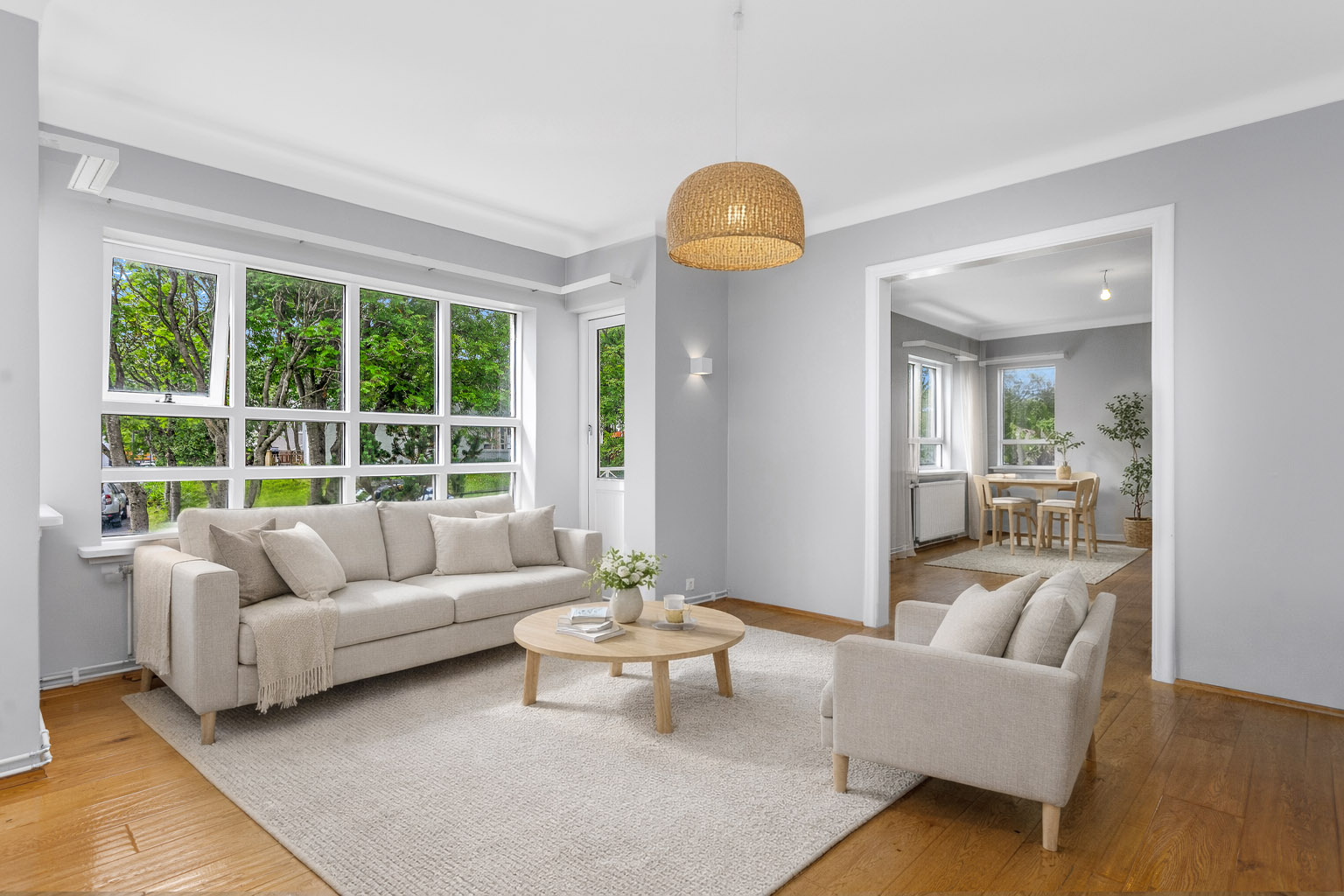Í sviðsetningu er hægt að setja inn húsgögn, gólfefni, innréttingar, lýsingu og aðra þætti sem hjálpa til við að skýra notkun rýma og heildaryfirbragð eignarinnar. Allt er unnið út frá raunverulegum forsendum eignarinnar og með hófsemi, þannig að framsetningin standist skoðun þegar komið er á staðinn. Markmiðið er ekki að fegra eða ýkja, heldur að setja hlutina í samhengi og gera fólki kleift að ímynda sér daglegt notagildi rýmanna. Allar eignir líta óumdeilanlega betur út með fallegum húsgögnum heldur en tómar.