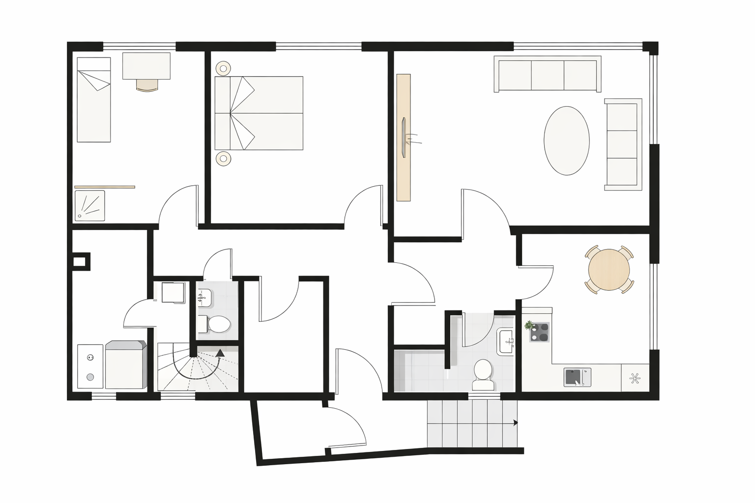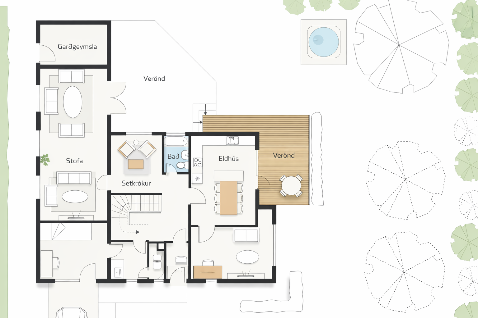 Við bjóðum upp á endurteiknaðar 2D teikningar sem hreinsa út óþarfa smáatriði og leggja áherslu á skipulag, rými og tengingar innan eignarinnar. Markmiðið er að gera teikningarnar læsilegar og auðskiljanlegar. Eins er oft sem breytingar/viðbætur hafa átt sér stað. Þar má nefna breytingu á herbergjaskipan, ef pallur hefur verið byggður þá er honum bætt við o.s.frv. Teikningar sem sækja má á vef sveitarfélagana eru þar að auki oft óskýrar og búið að breyta innra skipulagi svo þær sýna oft ekki rétta mynd af eigninni.