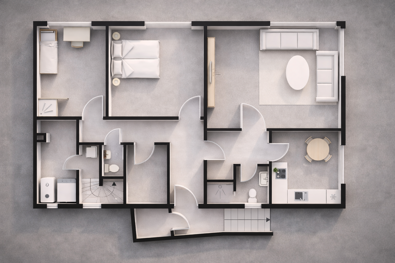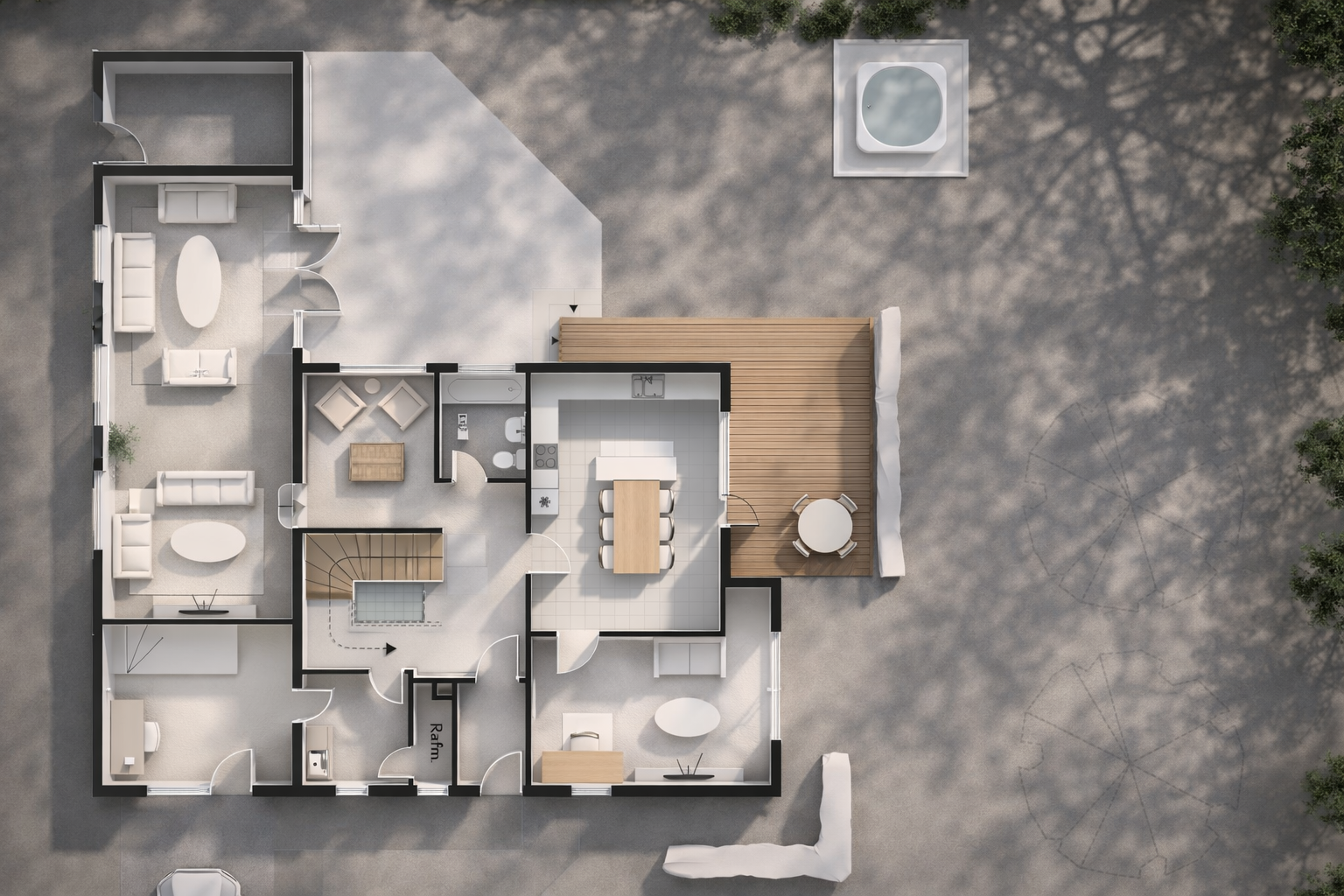 Við bjóðum upp á endurteiknaðar 2D teikningar sem hreinsa út óþarfa smáatriði og leggja áherslu á skipulag, rými og tengingar innan eignarinnar. Markmiðið er að gera teikningarnar læsilegar og auðskiljanlegar. Eins er oft sem breytingar/viðbætur hafa átt sér stað. Þar má nefna breytingu á herbergjaskipan, ef pallur hefur verið byggður þá er honum bætt við o.s.frv. Teikningar sem sækja má á vef sveitarfélagana eru þar að auki oft óskýrar og búið að breyta innra skipulagi svo þær sýna oft ekki rétta mynd af eigninni.
